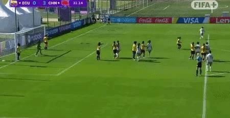 比赛第31分钟,曾屹婕直塞给陈睿琳,后者小角度扣门,厄瓜多尔醒目队员打入乌龙球。中国队3比0超越厄瓜多尔队。