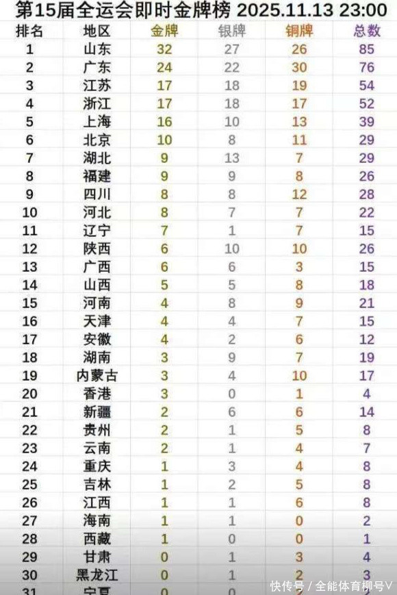 15运金牌榜:山东日夺7金、32金第一,广东30金第二,江苏19金第三
